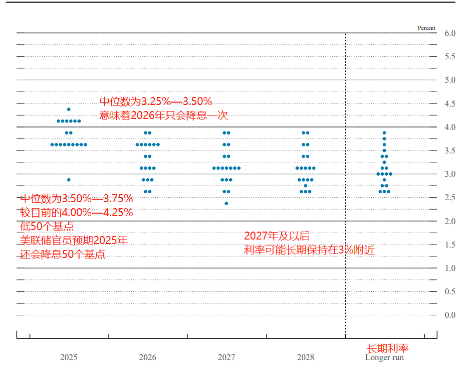 备受市场关注的利率点阵图显示,美联储官员们目前的中位预期是2025年还有两次各25个基点的降息。9月降息后,除米兰的18位官员中,有1人认为年底前应该加息1次,另有6人认为年内不再调整,有2位官员认为年内应该再降息25个基点;另外有9名官员认为今年应该再降息50个基点,也就是两次25个基点的标准降息。这9名官员再加上米兰,构成美联储预期年内还要降息两次的中位判断。