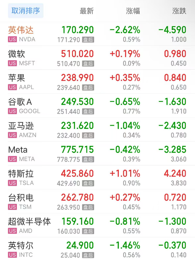 热门美股中,英伟达跌2.63%,微软涨0.19%,苹果涨0.35%,谷歌C跌0.63%,谷歌A跌0.65%,亚马逊跌1.04%,Meta跌0.42%,特斯拉涨1.01%,台积电涨0.28%,超微半导体跌0.81%,英特尔跌1.46%。