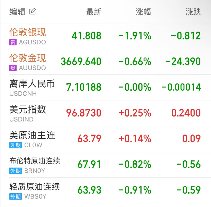受美元反弹的拖累,现货黄金创下新高后大跌,一度触及3650美元,伦敦金最终收跌0.68%,收报3668.82美元/盎司;伦敦银最终收跌1.91%,报41.804美元/盎司。