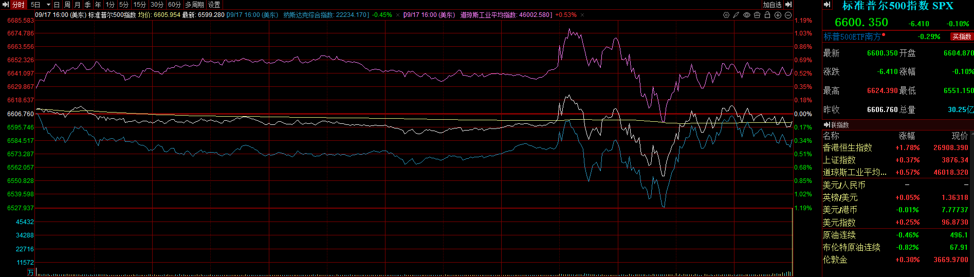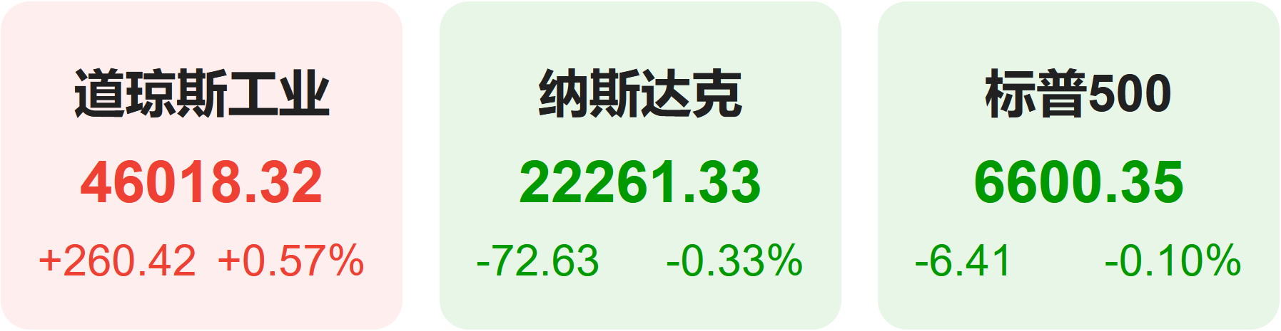 截至收盘,标普500指数跌0.10%,报6600.35点;道琼斯指数涨0.57%,报46018.32点;纳斯达克指数跌0.33%,报22261.33点。