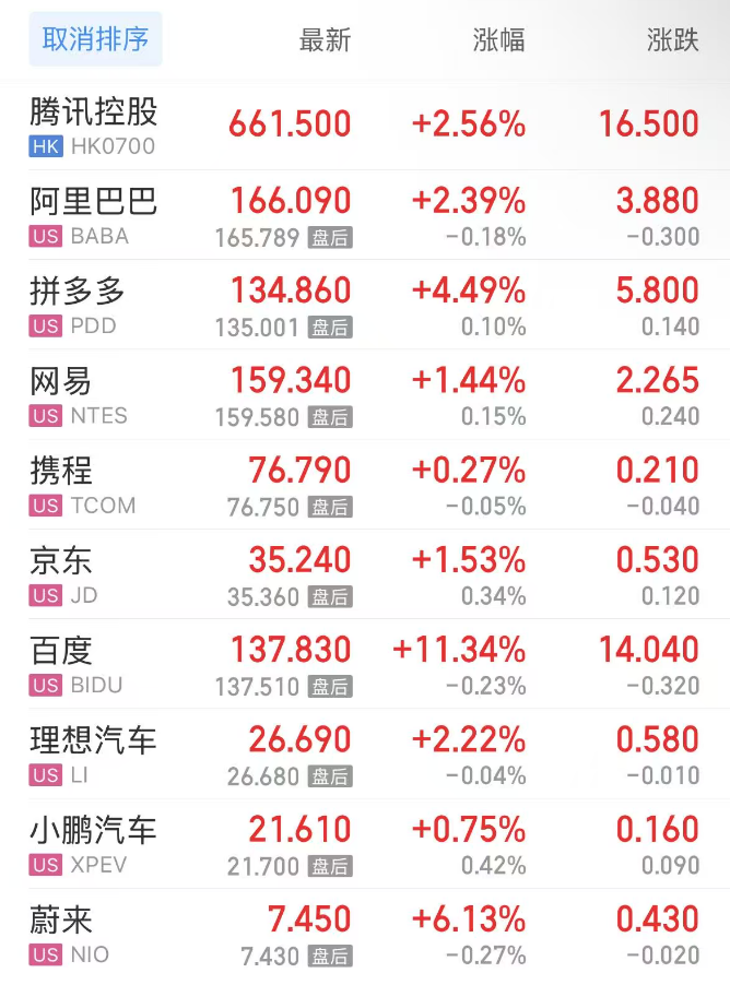 热门中概股方面,腾讯控股(港股)涨2.56%,阿里巴巴涨2.39%,拼多多涨4.49%,网易涨1.44%,携程涨0.27%,百度涨11.34%,理想汽车涨2.22%,小鹏汽车涨0.75%,蔚来涨6.13%。