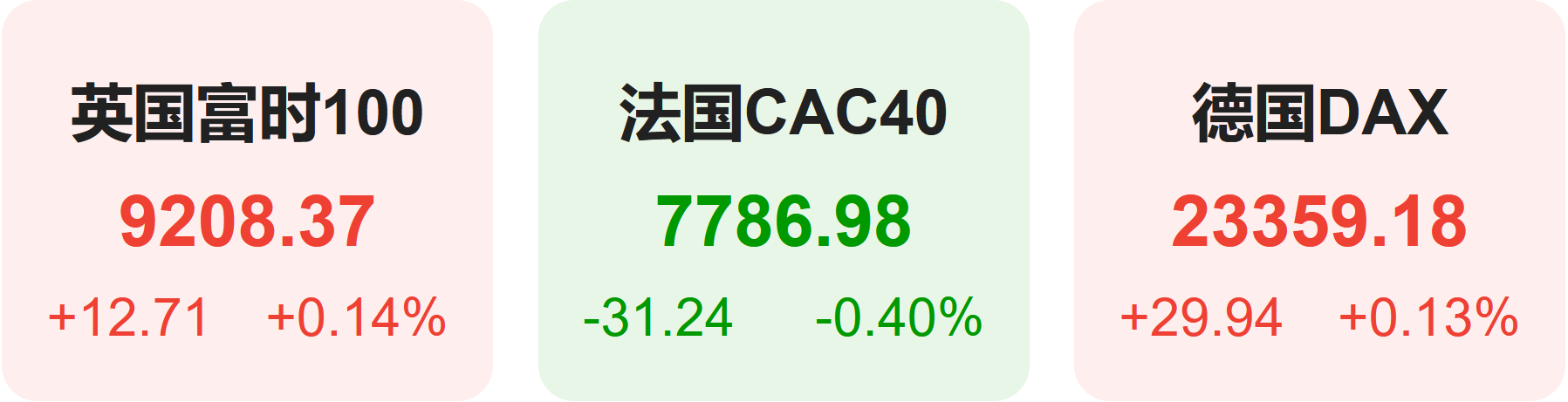 欧洲股市方面,英国富时100指数小幅上涨0.14%,报9208点。法国CAC40指数小幅下跌0.40%,报7787点。德国DAX指数小幅上涨0.13%,报23359点。