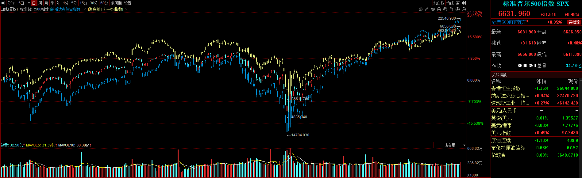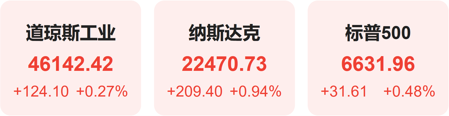 截至收盘,标普500指数涨0.48%,报6631.96点;道琼斯指数涨0.27%,报46142.42点;纳斯达克指数涨0.94%,报22470.73点。值得一提的是,这是近四年来,三大股指与小盘股指首次集体收创新高。