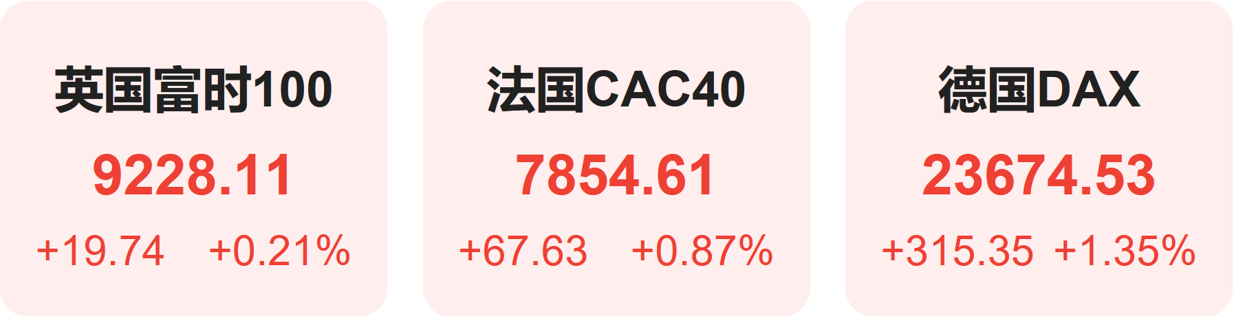 欧洲股市方面,英国富时100指数小幅上涨0.21%,报9228点。法国CAC40指数小幅上涨0.87%,报7855点。德国DAX指数上涨1.35%,报23675点。