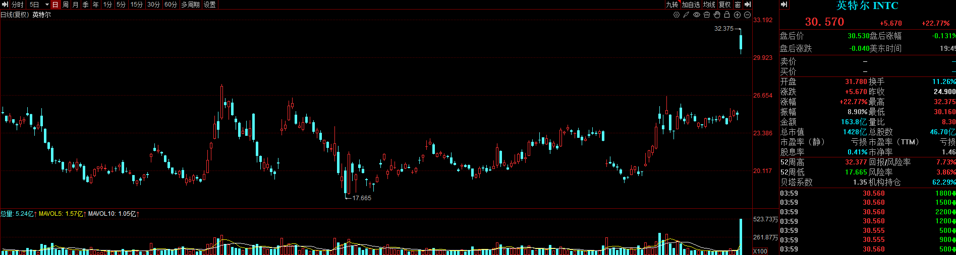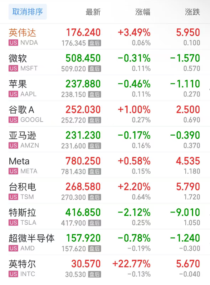 热门美股中,英伟达涨3.49%,微软跌0.31%,苹果跌0.47%,谷歌C涨0.99%,谷歌A涨1.00%,亚马逊跌0.17%,Meta涨0.59%,台积电涨2.20%,特斯拉跌2.12%,超微半导体跌0.78%,英特尔涨22.77%。