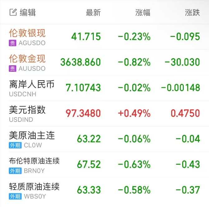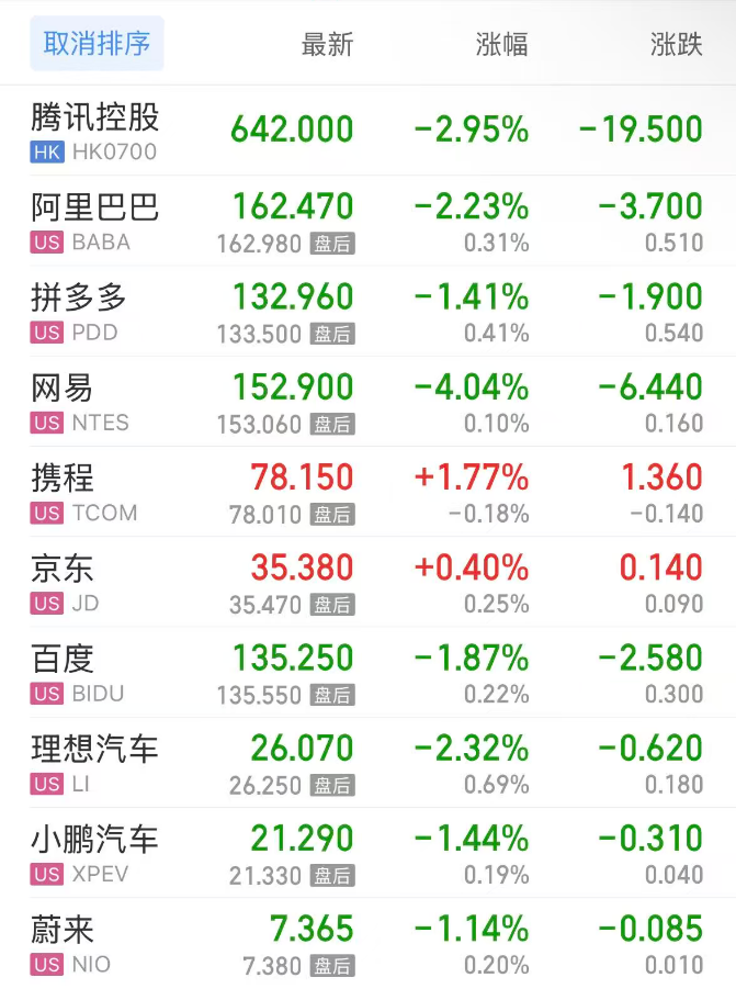 热门中概股方面,腾讯控股(港股)跌2.95%,阿里巴巴跌2.23%,拼多多跌1.41%,网易跌4.04%,携程涨1.77%,百度跌1.87%,理想汽车跌2.32%,小鹏汽车跌1.44%,蔚来跌1.14%。