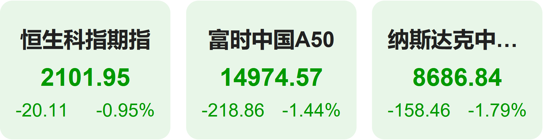 9月18日,隔夜恒生科技指数期货下跌0.95%,纳斯达克中国金龙指数下跌1.79%,富时中国A50指数下跌1.44%。