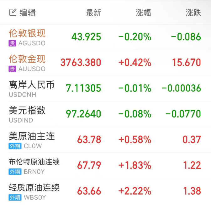 因恢复伊拉克库尔德地区石油出口的协议磋商遇阻,缓解了部分投资者对全球供应过剩的担忧,国际原油小幅反弹。WTI原油在欧盘时段开启涨势,并重回63美元上方,日内涨超2%,最终收涨2.22%,报63.66美元/桶;布伦特原油最终收涨1.83%,报67.79美元/桶。