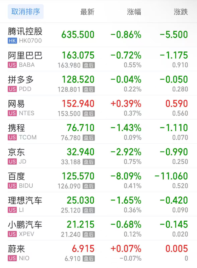 热门中概股方面,腾讯控股(港股)跌0.86%,阿里巴巴跌0.72%,拼多多跌0.04%,网易涨0.39%,携程跌1.43%,百度跌8.10%,理想汽车跌1.65%,小鹏汽车跌0.68%,蔚来涨0.07%。