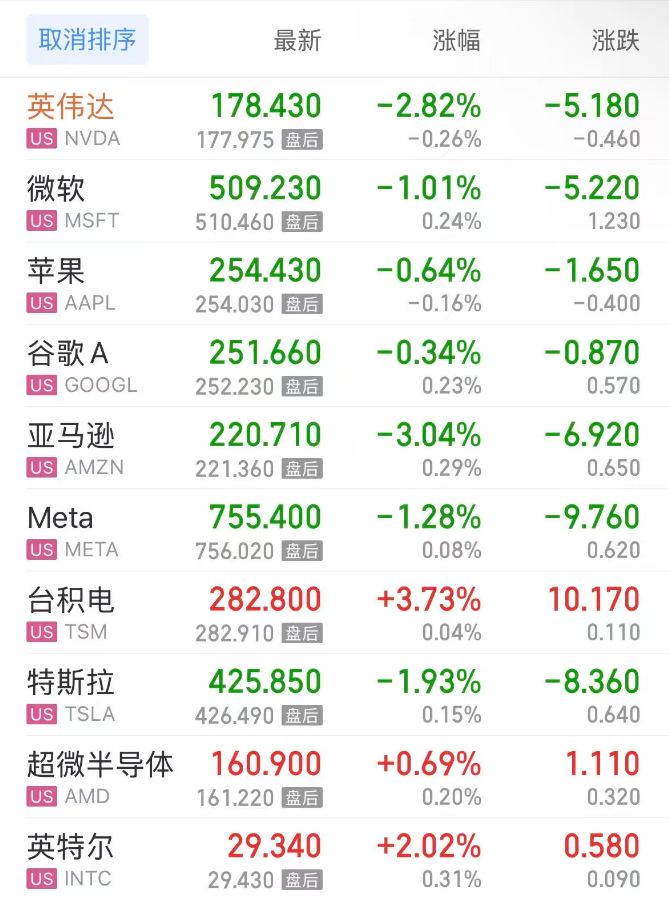 热门美股中,英伟达跌2.82%,微软跌1.02%,苹果跌0.64%,谷歌C跌0.21%,谷歌A跌0.35%,亚马逊跌3.04%,Meta跌1.28%,台积电涨3.73%,特斯拉跌1.93%,超微半导体涨0.70%,英特尔涨2.02%。