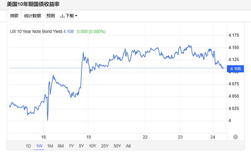 美债收益率小幅震荡,基准的10年期美债收益率收报4.107%,对美联储政策利率敏感的2年期美债收益率收报3.594%。
