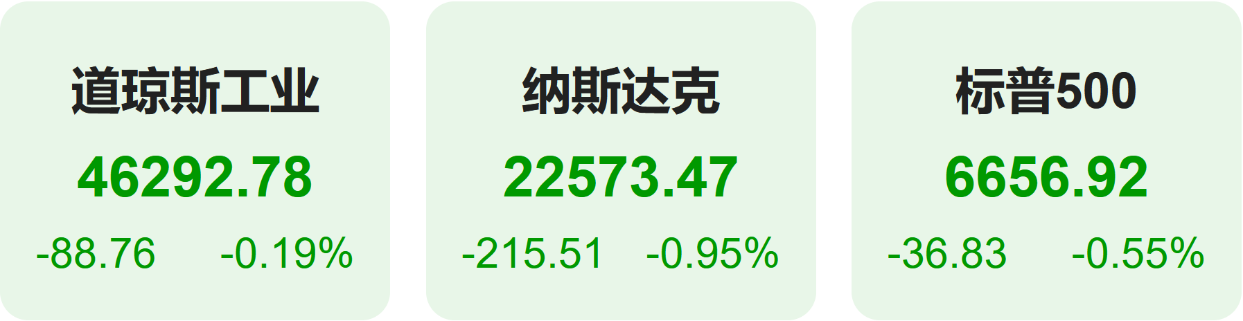 截至收盘,标普500指数跌0.55%,报6656.92点;道琼斯指数跌0.19%,报46292.78点;纳斯达克指数跌0.95%,报22573.47点。