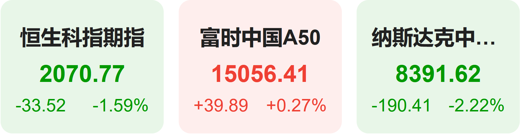 9月23日,隔夜恒生科技指数期货下跌1.59%,纳斯达克中国金龙指数下跌2.22%,富时中国A50指数上涨0.27%。