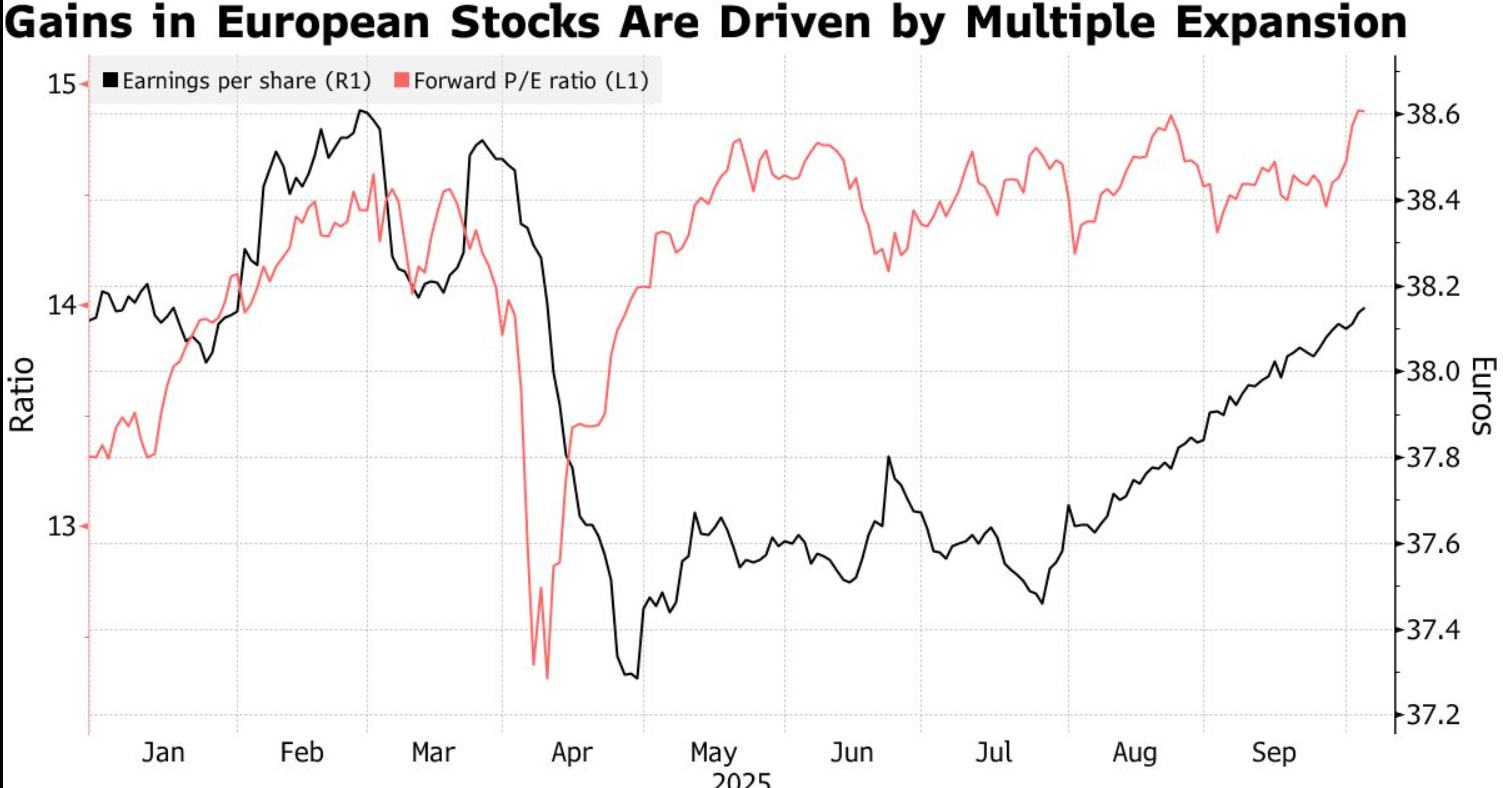 “今年欧洲股市屡创新高的强劲涨幅基本上由AI热潮驱动的估值倍数扩张所贡献。”来自Union Bancaire Privée的瑞士及全球股票投资专家Maud Giese表示。“短期内情绪可能保持建设性,但如果宏观经济风险兑现,可能会迅速出现反转。”