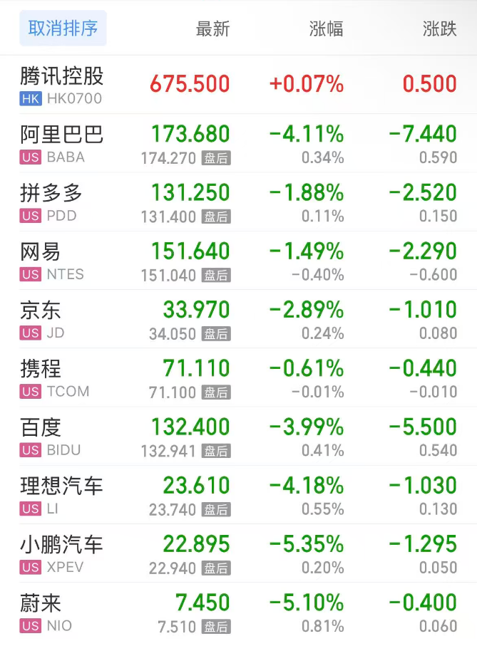 热门中概股方面,腾讯控股(港股)涨0.07%,阿里巴巴跌4.11%,拼多多跌1.88%,网易跌1.49%,携程跌0.62%,百度跌3.99%,理想汽车跌4.18%,小鹏汽车跌5.35%,蔚来跌5.10%。