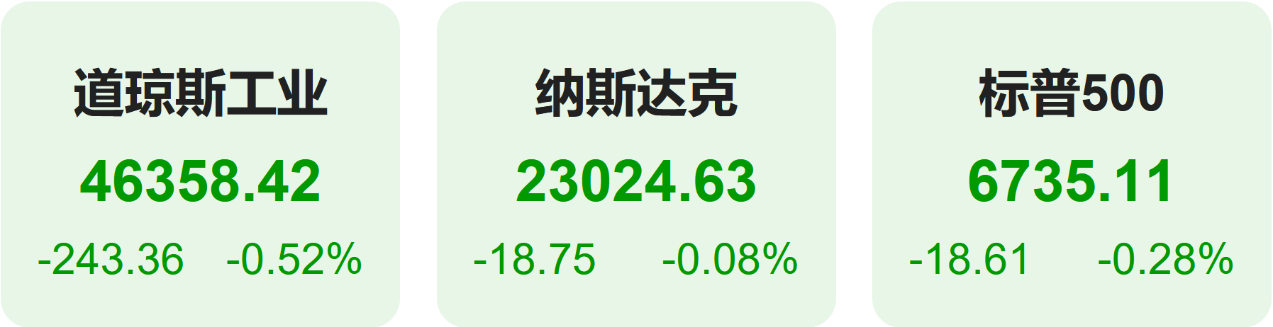 截至收盘,标普500指数跌0.28%,报6735.11点;道琼斯指数跌0.52%,报46358.42点;纳斯达克指数跌0.08%,报23024.63点。