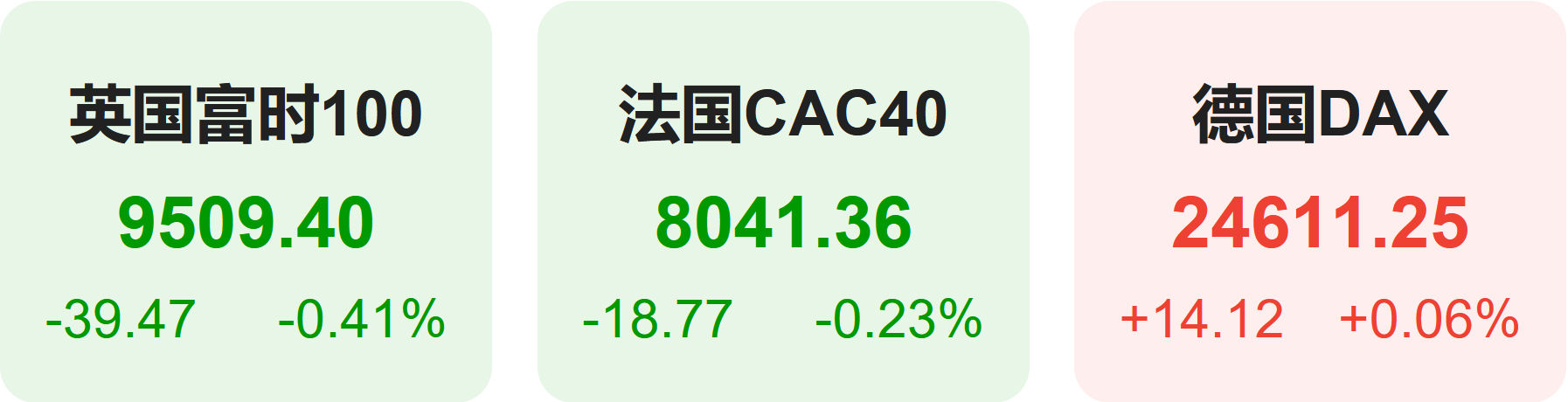 欧洲股市方面,英国富时100指数小幅下跌0.41%,报9509点。法国CAC40指数小幅下跌0.23%,报8041点。德国DAX指数小幅上涨0.06%,报24611点。