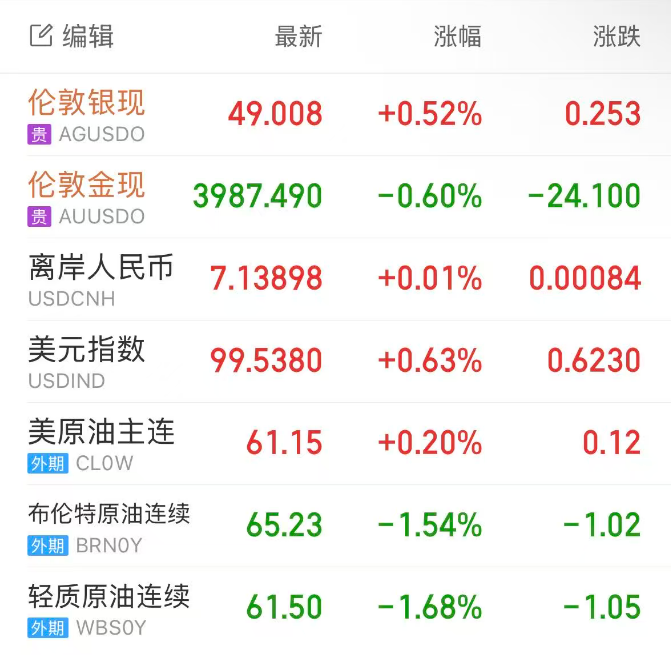 美元走高,且以色列和哈马斯达成停火协议后黄金投资者获利了结,现货黄金一度较历史高位跌超100美元,伦敦金最终收跌0.62%,收报3987.72美元/盎司;现货白银坐上过山车,最高突破51美元/盎司,再创14年新高,美盘大幅下挫,抹去日内大部分涨幅,伦敦银最终收涨0.52%,报49美元/盎司。