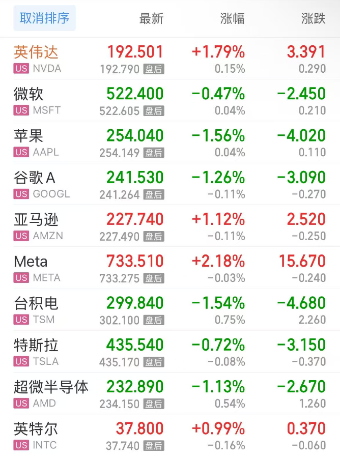 热门美股中,英伟达涨1.79%,微软跌0.47%,苹果跌1.56%,谷歌C跌1.32%,谷歌A跌1.26%,亚马逊涨1.12%,Meta涨2.18%,台积电跌1.54%,特斯拉跌0.72%,超微半导体跌1.13%,英特尔涨0.99%。