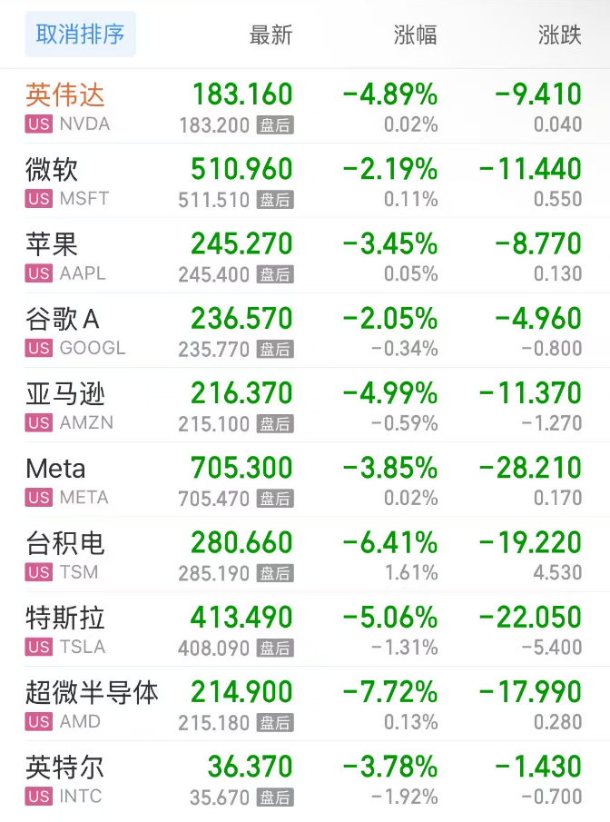 热门美股中,英伟达跌4.89%,微软跌2.19%,苹果跌3.45%,谷歌C跌1.95%,谷歌A跌2.05%,亚马逊跌4.99%,Meta跌3.85%,台积电跌6.41%,特斯拉跌5.06%,超微半导体跌7.72%,英特尔跌3.78%。