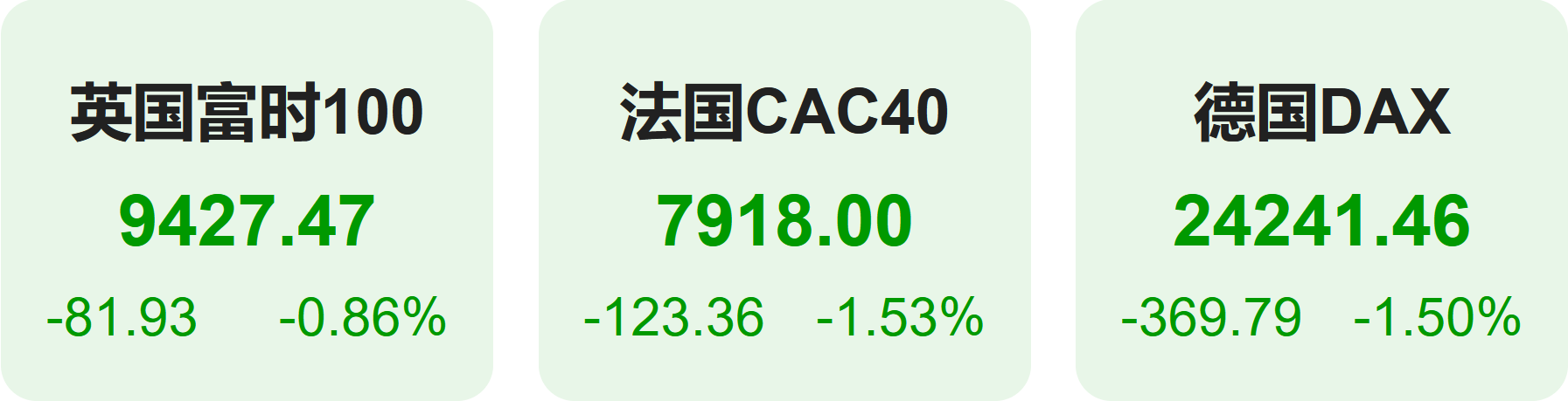 上周五,欧洲股市方面,英国富时100指数小幅下跌0.86%,报9427点。法国CAC40指数下跌1.53%,报7918点。德国DAX指数下跌1.50%,报24241点。