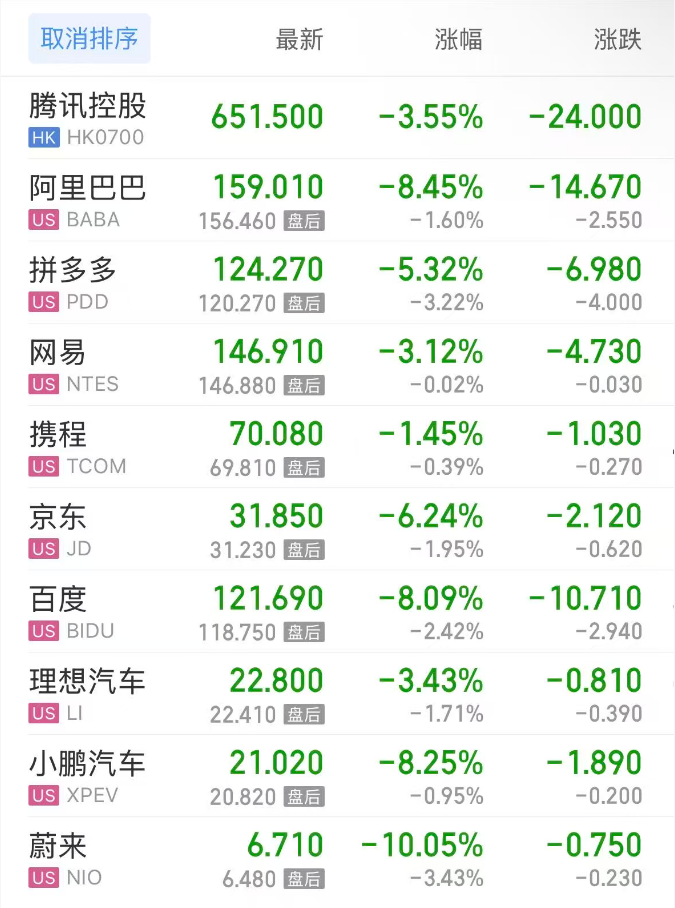 上周五热门中概股方面,腾讯控股(港股)跌3.55%,阿里巴巴跌8.45%,拼多多跌5.32%,网易跌3.12%,携程跌1.45%,百度跌8.09%,理想汽车跌3.43%,小鹏汽车跌8.25%,蔚来跌10.05%。
