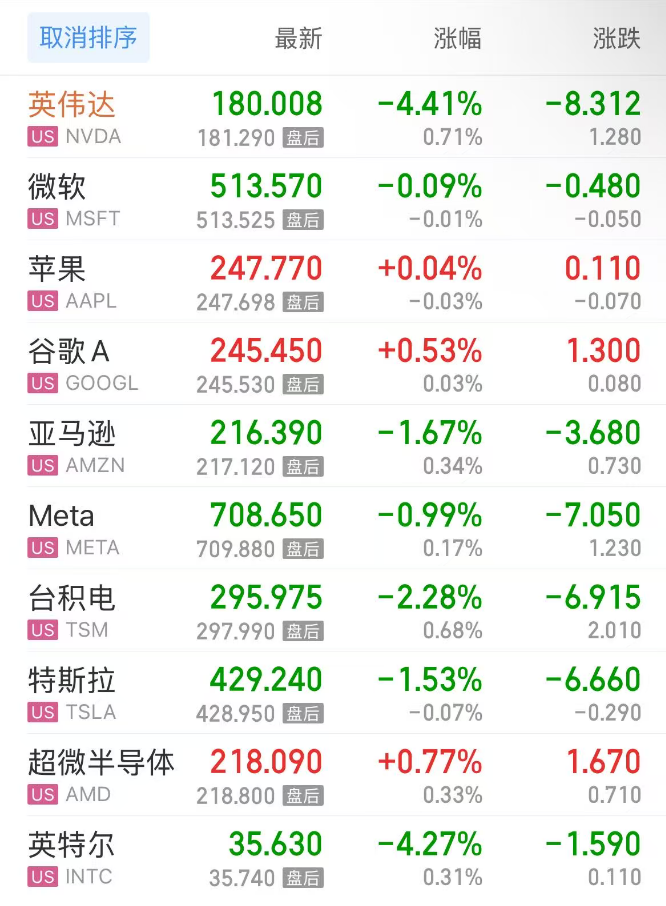 热门美股中,英伟达跌4.41%,微软跌0.09%,苹果涨0.04%,谷歌C涨0.63%,谷歌A涨0.53%,亚马逊跌1.67%,Meta跌0.99%,台积电跌2.28%,特斯拉跌1.53%,超微半导体涨0.77%,英特尔跌4.27%。