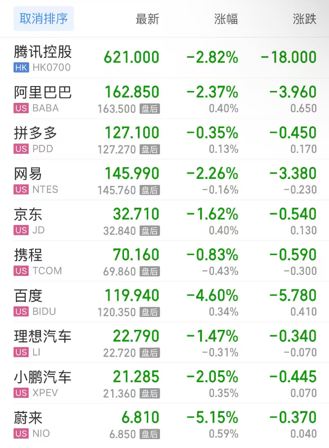 热门中概股方面,腾讯控股(港股)跌2.82%,阿里巴巴跌2.37%,拼多多跌0.35%,网易跌2.26%,携程跌0.83%,百度跌4.60%,理想汽车跌1.47%,小鹏汽车跌2.05%,蔚来跌5.15%。