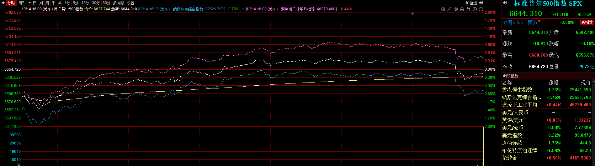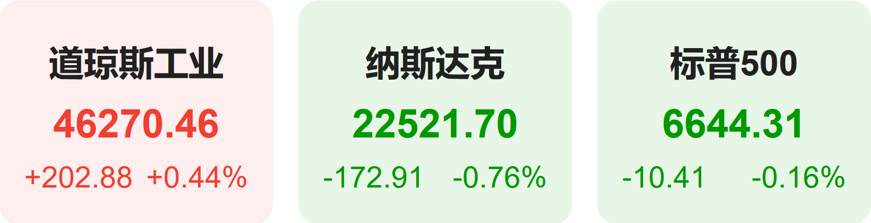 截至收盘,标普500指数跌0.16%,报6644.31点;道琼斯指数涨0.44%,报46270.46点;纳斯达克指数跌0.76%,报22521.70点。