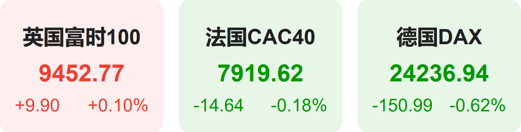 欧洲股市方面,英国富时100指数小幅上涨0.10%,报9453点。法国CAC40指数小幅下跌0.18%,报7920点。德国DAX指数小幅下跌0.62%,报24237点。