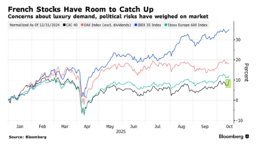LVMH的财报利好与政治的积极进展,为CAC40指数注入了亟需的活力。今年以来,该指数一直落后于德国DAX、西班牙IBEX35等欧洲同类股指,主要原因是中国市场奢侈品需求疲软以及法国国内政局动荡。美国银行10月基金经理调查显示,法国曾是当时最不受青睐的欧洲市场。