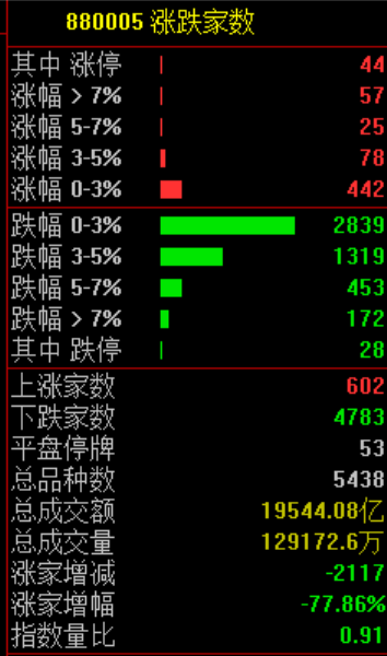 两市仅602只个股上涨,44只个股涨停,4783只个股下跌。