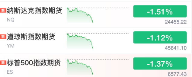 美股三大股指期货延续跌势,纳斯达克100指数期货跌1.5%,标普500指数期货跌1.4%,道指期货跌1%。