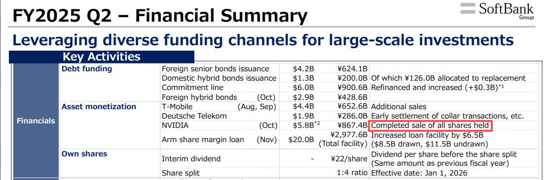 软银周二公布了截至9月末的2025财年第二季度财报。财报显示,该公司第二财季利润远超预期,因积极的人工智能投资为其带来了丰厚的回报。同时,其已于10月出售了所持全部英伟达股份,合计约3210万股,总价值约58.3亿美元(约合人民币415亿元)。此次出售未反映在软银第二季度财报中,该公司也未披露出售原因。