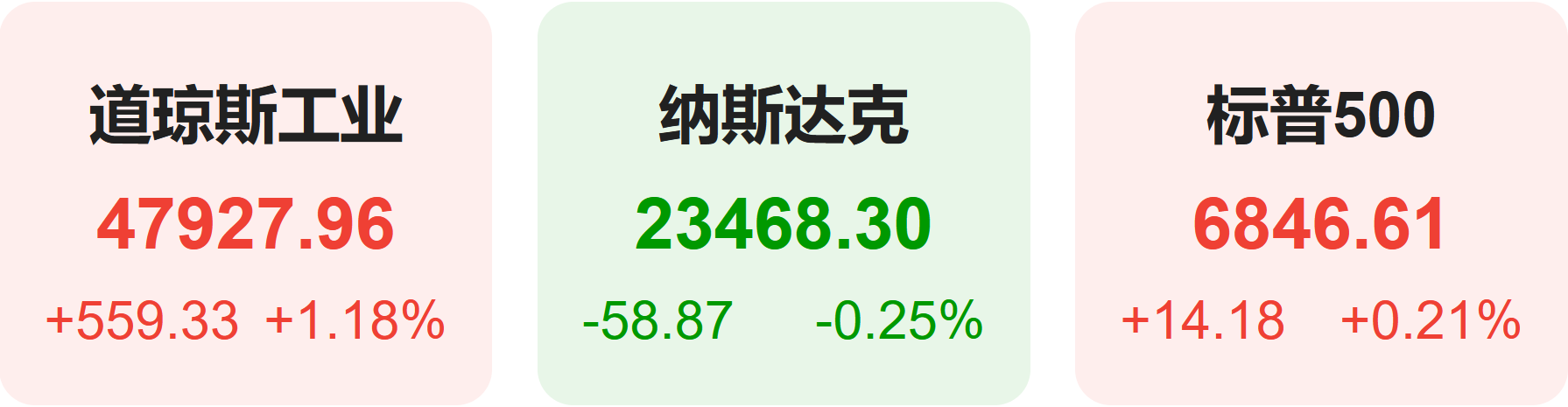 截至收盘,标普500指数涨0.21%,报6846.61点;道琼斯指数涨1.18%,报47927.96点;纳斯达克指数跌0.25%,报23468.30点。