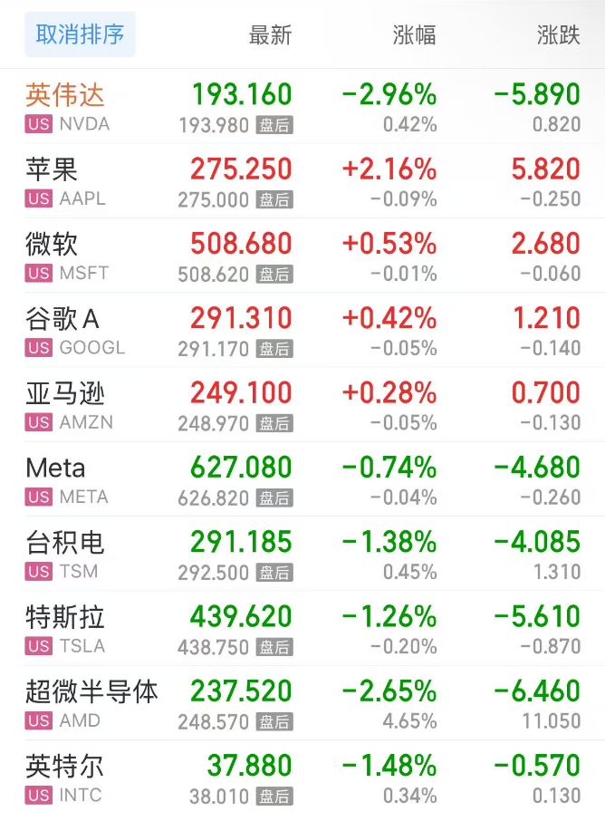 热门美股中,英伟达跌2.96%,苹果涨2.16%,微软涨0.53%,谷歌C涨0.40%,谷歌A涨0.42%,亚马逊涨0.28%,Meta跌0.74%,台积电跌1.38%,特斯拉跌1.26%,超微半导体跌2.65%,英特尔跌1.48%。