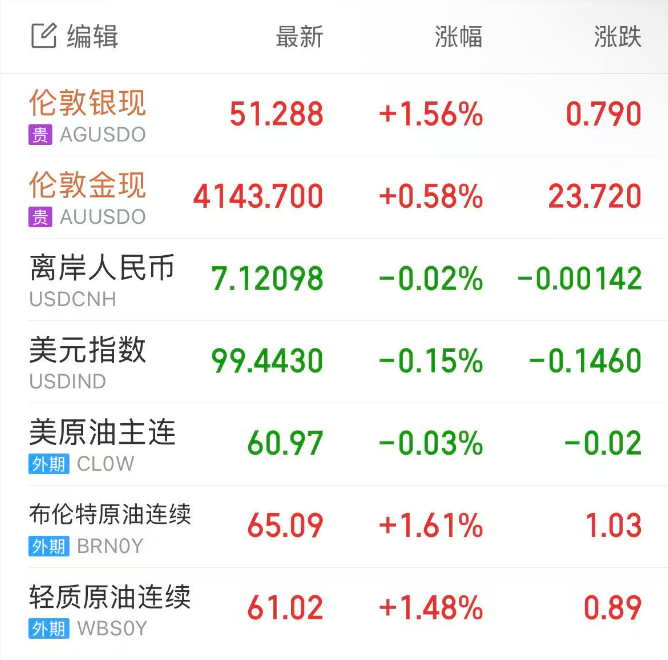 现货黄金盘中多次逼近4150美元关口,创近三周来的新高,但未能冲上此处,反而回吐部分涨幅,伦敦金最终收涨0.57%,收报4143.27美元/盎司;现货白银稳站50美元关口上方,伦敦银最终收涨1.64%,报51.327美元/盎司。