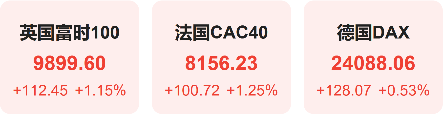 欧洲股市方面,英国富时100指数上涨1.15%,报9900点。法国CAC40指数上涨1.25%,报8156点。德国DAX指数小幅上涨0.53%,报24088点。