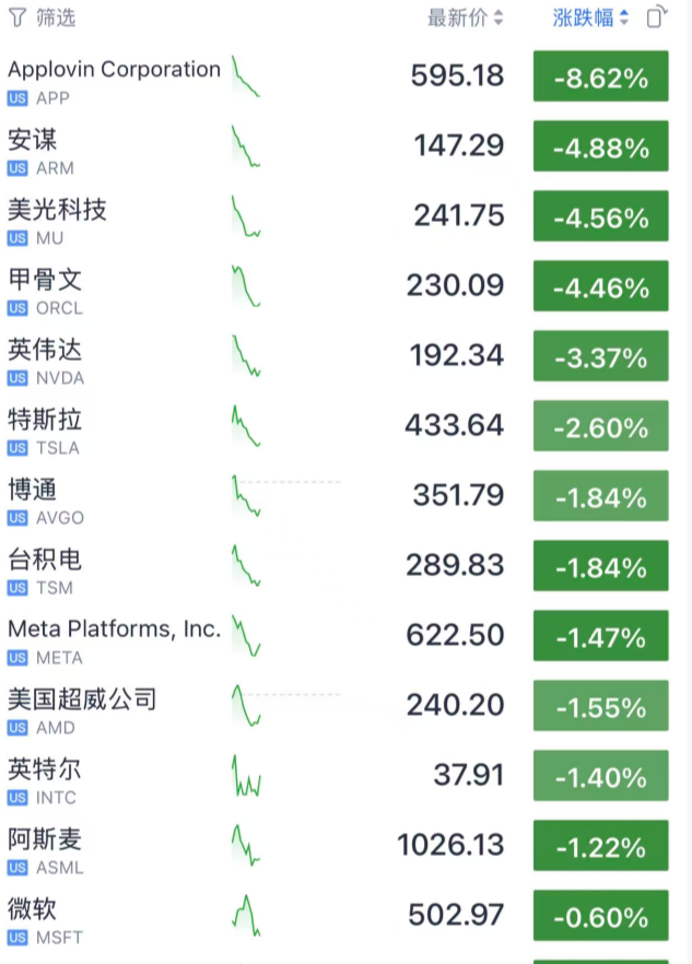 大型科技股成为拖累。软银集团以58.3亿美元清仓英伟达,以资助自身的AI投资,英伟达股价持续走低,跌超3%。