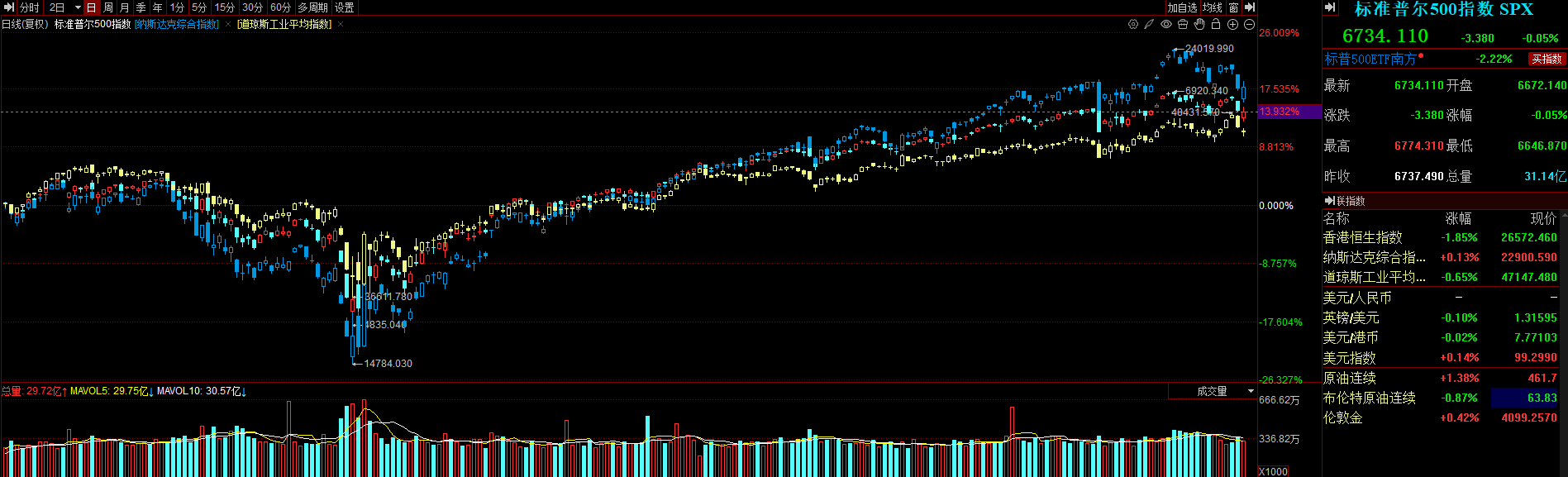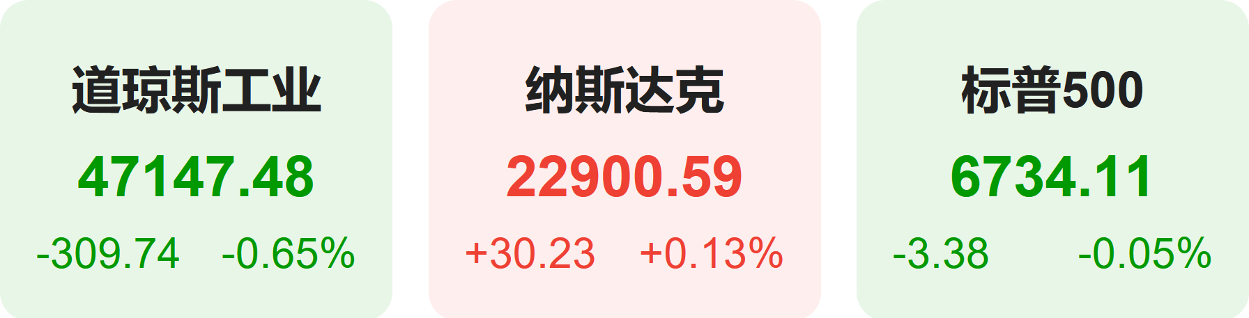 截至上周五收盘,标普500指数跌0.05%,报6734.11点;道琼斯指数跌0.65%,报47147.48点;纳斯达克指数涨0.13%,报22900.59点。