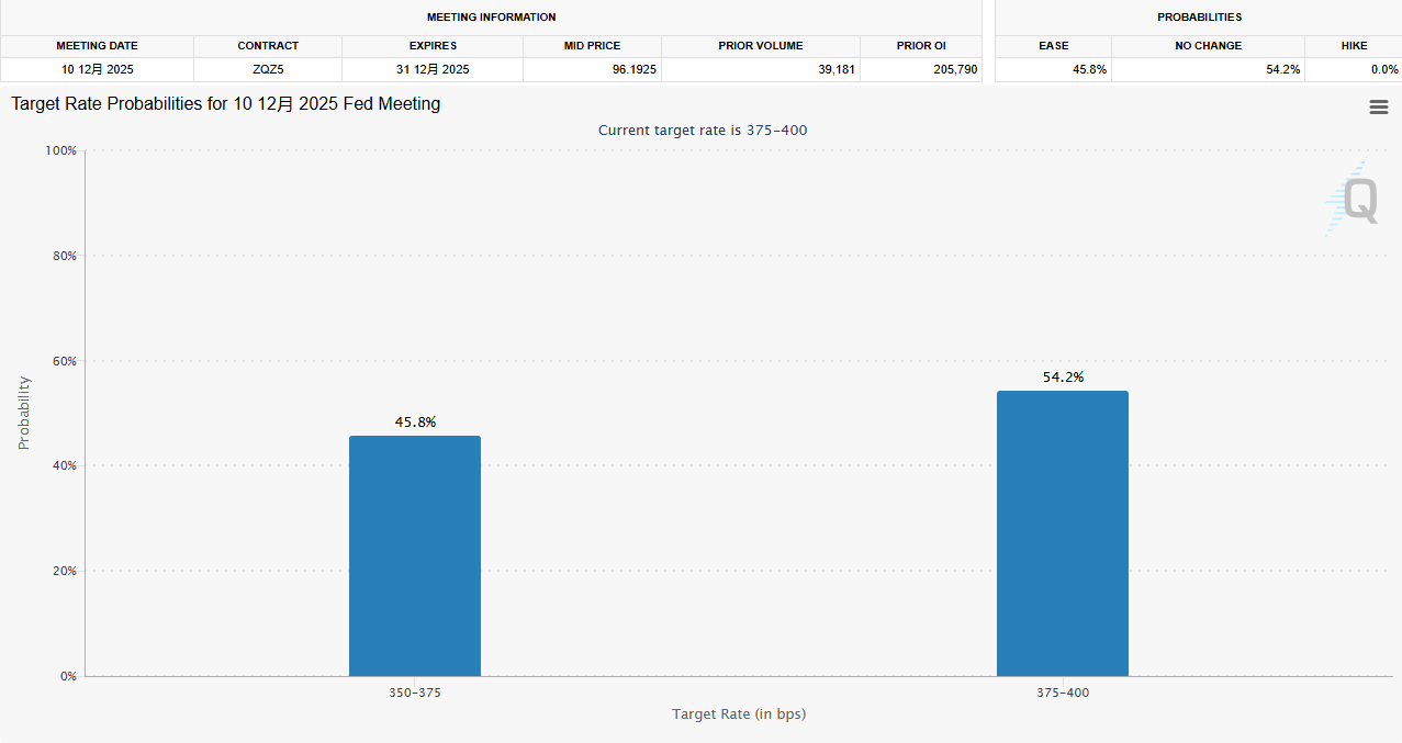 由于有证据显示,美国通胀仍具韧性,加上美联储官员近期连续放鹰,12月降息预期骤降。CME美联储观察工具显示,目前市场认为美联储12月降息25个基点的概率仅为45.8%。这一点令投资者有所顾忌,因为他们担心,美联储的抗通胀之路比预期的要更为长久。
