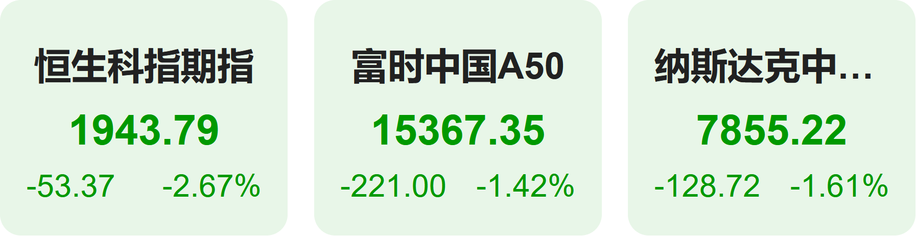 11月14日,隔夜恒生科技指数期货下跌2.67%,纳斯达克中国金龙指数下跌1.61%,富时中国A50指数下跌1.42%。