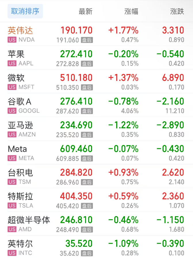 上周五,热门美股中,英伟达涨1.77%,苹果跌0.20%,微软涨1.37%,谷歌C跌0.77%,谷歌A跌0.78%,亚马逊跌1.22%,Meta跌0.07%,台积电涨0.93%,特斯拉涨0.59%,超微半导体跌0.46%,英特尔跌1.09%。
