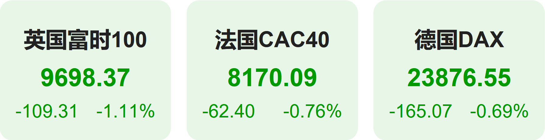 上周五,欧洲股市方面,英国富时100指数下跌1.11%,报9698点。法国CAC40指数小幅下跌0.76%,报8170点。德国DAX指数小幅下跌0.69%,报23877点。
