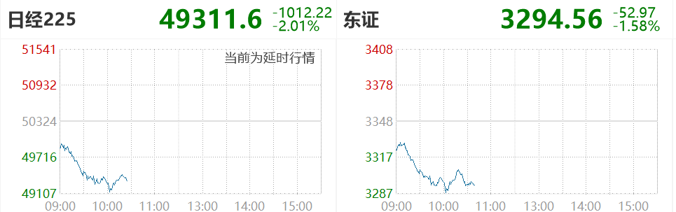 截至9:35左右,日经225指数跌超1000点,日经225指数下跌2%,日本东证指数跌超1.5%。