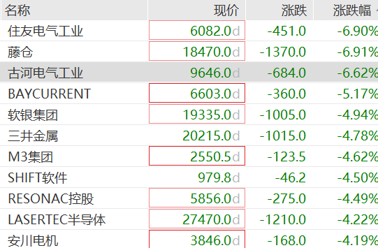 个股方面,截至发稿,住友电气工业跌近7%,软银集团跌近5%。昨天大跌的日本旅游股有所回调,资生堂跌超3%,日本航空跌0.22%,日本其他消费品/零售股方面,三丽鸥涨0.82%、亚瑟士跌1.81%、迅销跌0.39%。百货店经营商伊势丹三越控股公司股价下跌0.69%。