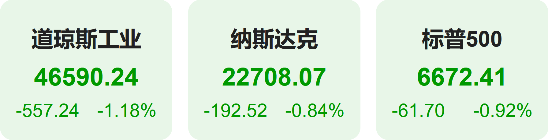 截至收盘,道琼斯指数跌1.18%,报46,590.24点;标普500指数跌0.92%,并跌破50日移动平均线,报6,672.41点;纳斯达克指数跌0.84%,报22,708.07点。