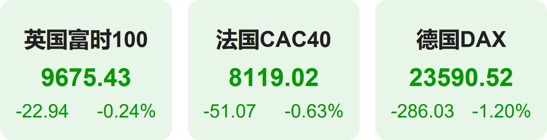 欧洲股市方面,英国富时100指数小幅下跌0.24%,报9675点。法国CAC40指数小幅下跌0.63%,报8119点。德国DAX指数下跌1.20%,报23591点。