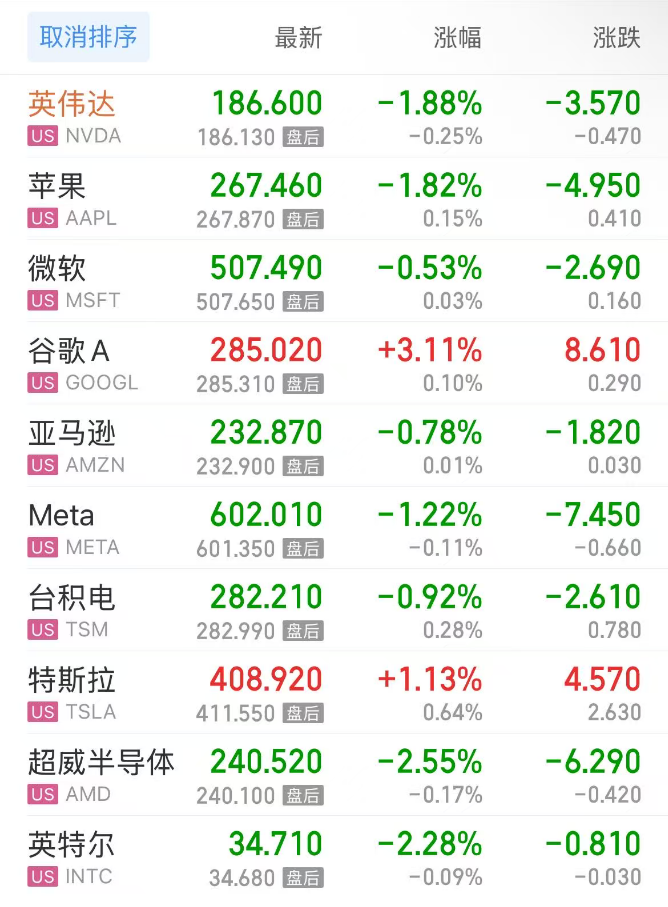 热门美股中,英伟达跌1.88%,苹果跌1.82%,微软跌0.53%,谷歌C涨3.11%,谷歌A涨3.12%,亚马逊跌0.78%,Meta跌1.22%,台积电跌0.92%,特斯拉涨1.13%,超威半导体跌2.55%,英特尔跌2.28%。