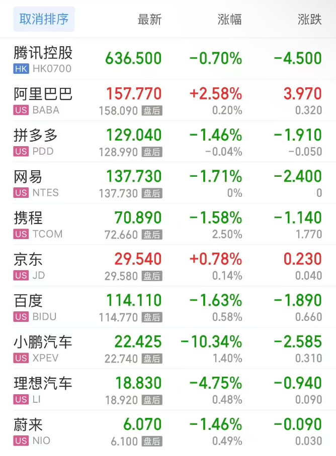 热门中概股方面,腾讯控股(港股)跌0.70%,阿里巴巴涨2.58%,拼多多跌1.46%,网易跌1.71%,携程跌1.58%,百度跌1.63%,小鹏汽车跌10.34%,理想汽车跌4.76%,蔚来跌1.46%。